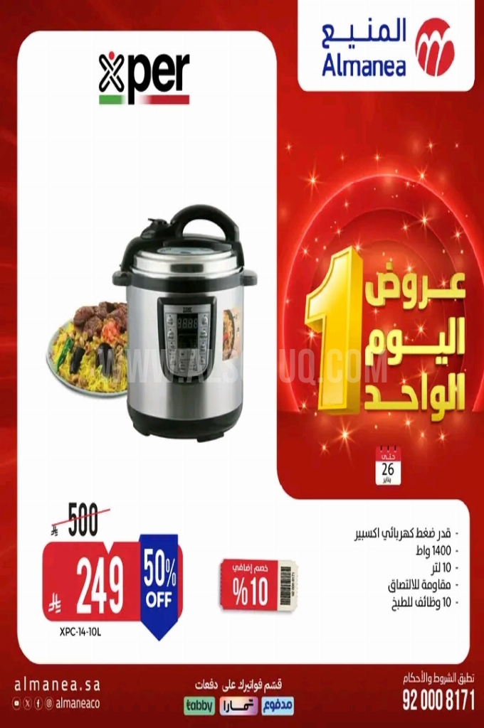 عروض المنيع اليوم 26 يناير 2026 الموافق 7 شعبان 1447 عروض اليوم الواحد . الجودة تصنع فرقاً والعروض تصنع قرارك! اختر الذكاء اليوم وابتسم للصفقة غداً. عروض المنيع ليوم الاثنين : تجدون ضمن منتجات الأسبوع : قلاية فيليبس 2000 واط 7.2 لتر لون اسود . مكنسة اكسبير 1800 واط 21 لتر . قلاية هوائية ننيجا 5.2 لتر لون رمادي 1750 واط . قطاعة اكسبير محرك من النحاس الخالص 400 واط 1.5 لتر شفرة مزدوجة . قدر ضغط كهربائي اكسبير 1400 واط 10 لتر مقاومة للالتصاق . وإليكم الصور الآتية على موقع عروض.
