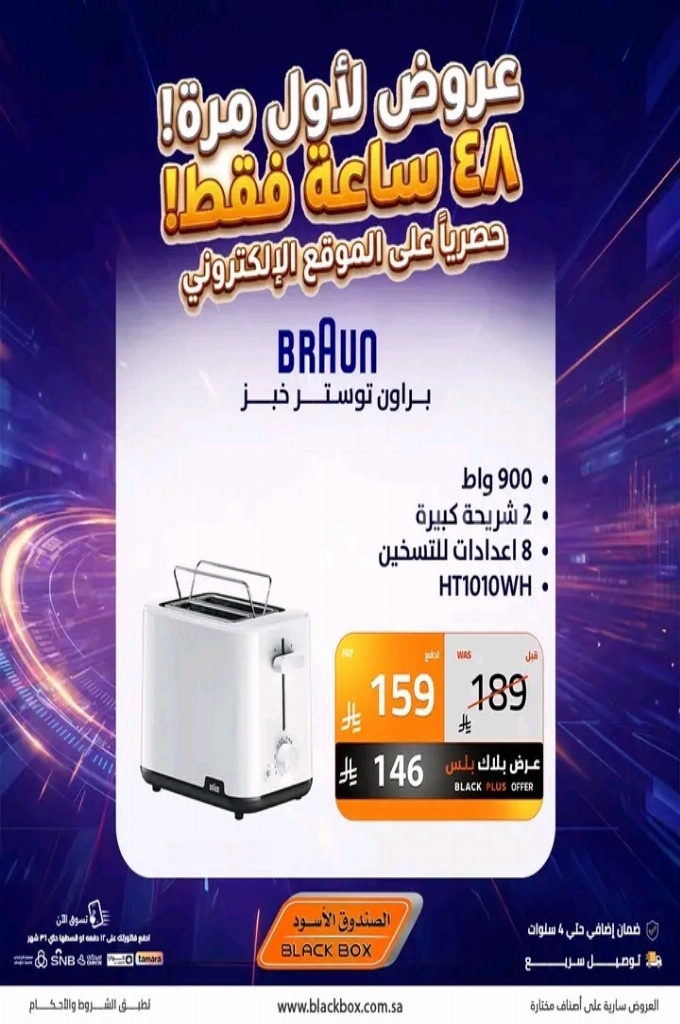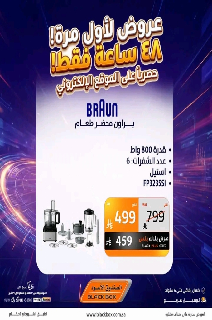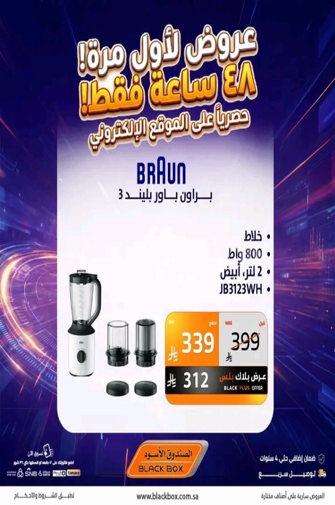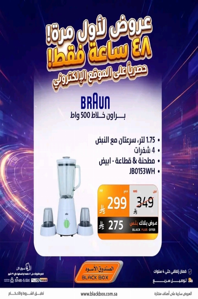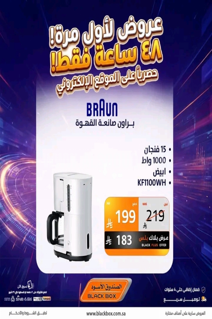 عروض الصندوق الاسود اليوم 1 أبريل 2026 الموافق 13 شوال 1447 عروض لاول مرة 48 ساعة فقط . الجودة تصنع فرقاً والعروض تصنع قرارك! اختر الذكاء اليوم وابتسم للصفقة غداً. عروض الصندوق الاسود ليوم الاربعاء : تجدون ضمن منتجات الأسبوع : غلاية مياه بيريل مع بيان مستوى المياه و مع لمبة بيان للتشغيل سعى الغلاية ٢ لتر ب قوة ١٥٠٠ واط و ضمان لمدة عام . شفاط زجاج بمقاس ٢٠ سم و بخامات عالية الجودة و سهولة التركيب . ماكبوك برو ام ٢ بذاكرة تخزين اس اس دي ٢٥٦ جيجا بايت . وإليكم الصور الآتية على موقع عروض.
