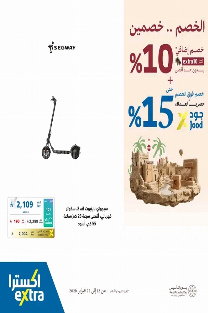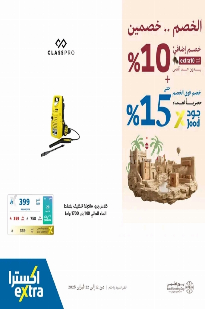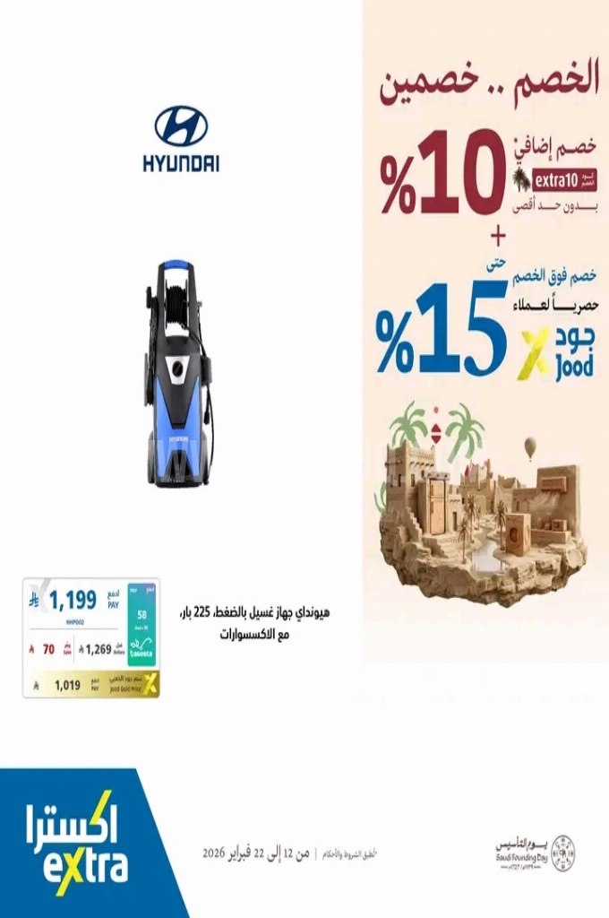 عروض اكسترا السعودية اليوم 14 فبراير 2026 الموافق 26 شعبان 1447 عروض يوم التأسيس . الجودة تصنع فرقاً والعروض تصنع قرارك! اختر الذكاء اليوم وابتسم للصفقة غداً. عروض اكسترا السعودية ليوم السبت : تجدون ضمن منتجات الأسبوع : فرن من تورنيدو ٤٦ لتر . تورنيدو مايكرويف ٢٥ لتر . جيباس ٣ في ١ مصباح يدوي ليد قابل لإعادة الشحن . تورنيدو هانت بلندر ٦٠٠ واط . تورنيدو مكنسة ١٦٠٠ واط . مروحة حائط من تورنيدو ١٨ بوصة . فريش خلاط ٣٦٠ واط . وإليكم الصور الآتية على موقع عروض.