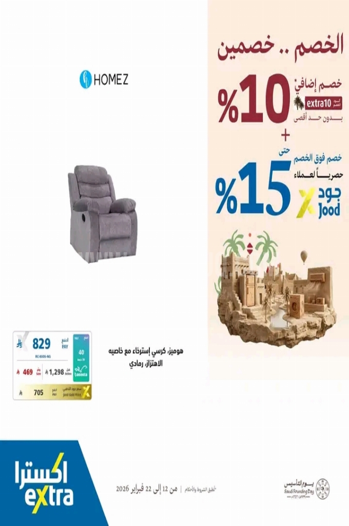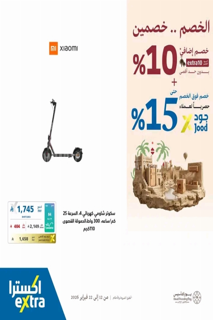 عروض اكسترا السعودية اليوم 22 فبراير 2026 الموافق 5 رمضان 1447 عروض بدل الخصم ثلاثة . الجودة تصنع فرقاً والعروض تصنع قرارك! اختر الذكاء اليوم وابتسم للصفقة غداً. عروض اكسترا السعودية ليوم الاحد : تجدون ضمن منتجات الأسبوع : كليكون عصارة الحمضيات ٩٠ واط . اس ام ساعة ذكية الترا . انجير ساعة ذكية . موتورولا ١٠ و شاحن جداري . انكر سلك لايتننج ٠,٩ متر . اوكي شاحن سيارة ٢ منفذ . تلفاز هايسنس يو اتش دي فور كيه . كاميرا كانون دي اس ال آر مع كرت ذاكرة و شنطة . وإليكم الصور الآتية على موقع عروض.