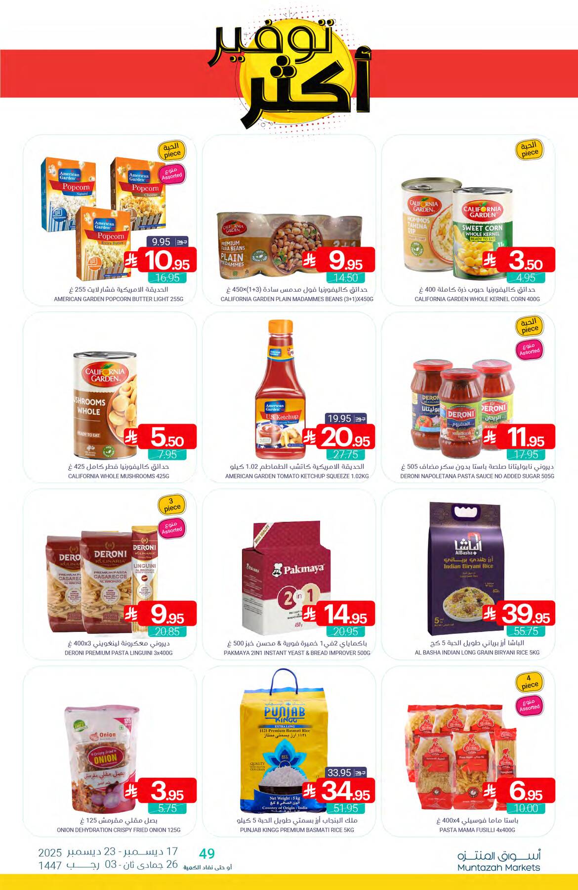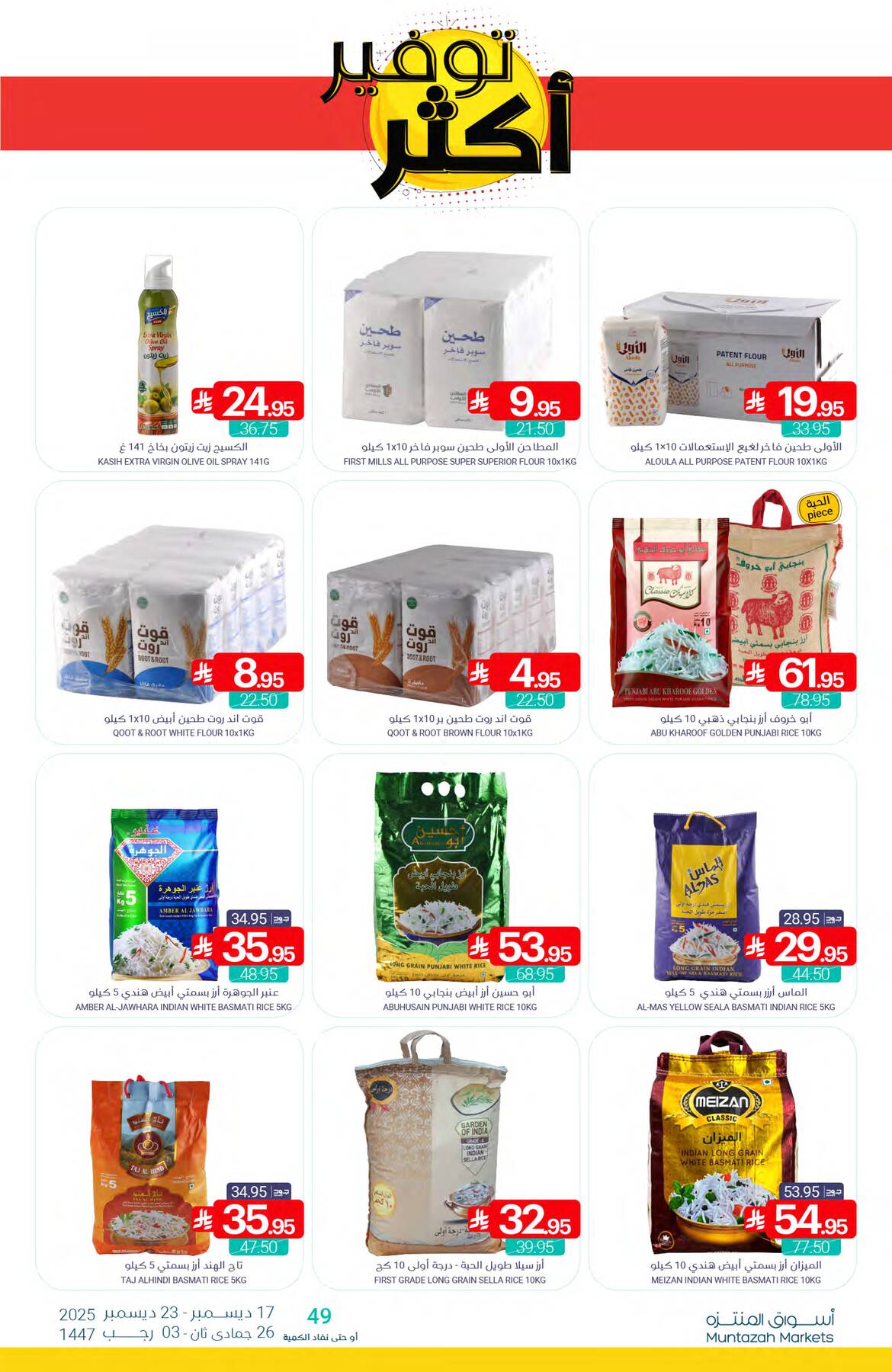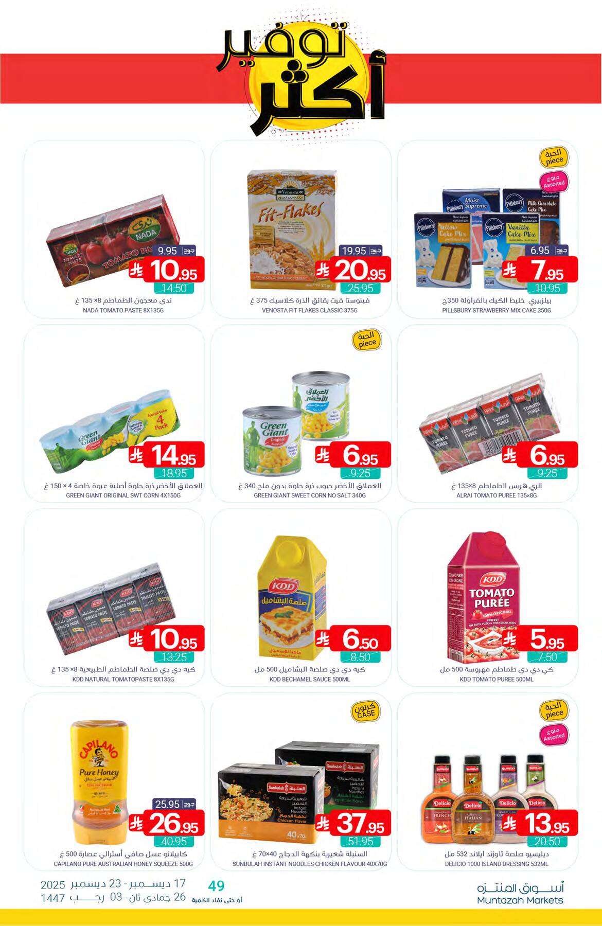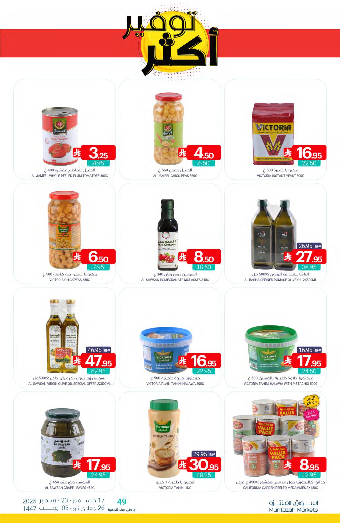 تقدم أسواق المنتزه (Muntazah Markets) حملة ترويجية جديدة تحت شعار “توفير أكثر”، مقدمةً مجموعة من العروض المتنوعة التي تشمل السلع الغذائية الأساسية، الخضروات، والفاكهة، بالإضافة إلى منتجات العناية المنزلية. العروض سارية ابتداءً من 17 ديسمبر وحتى 23 ديسمبر 2025.