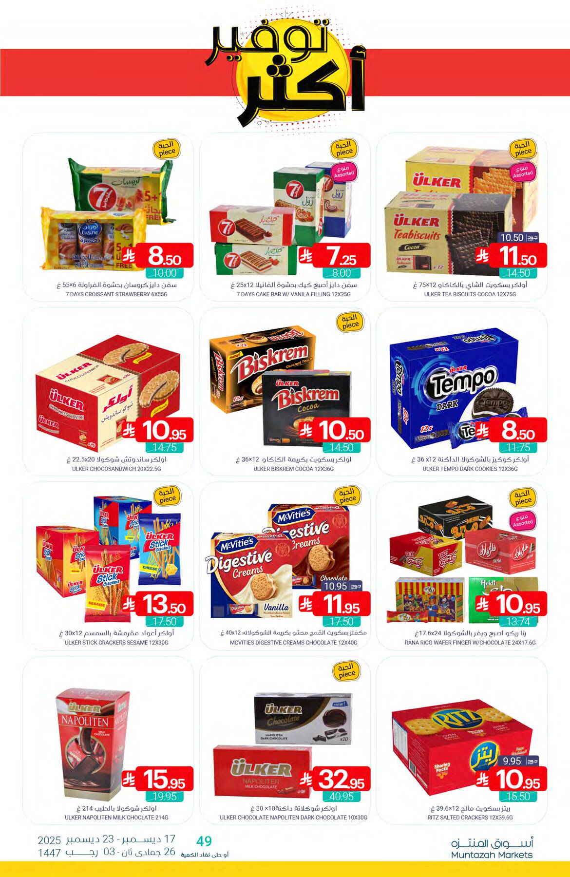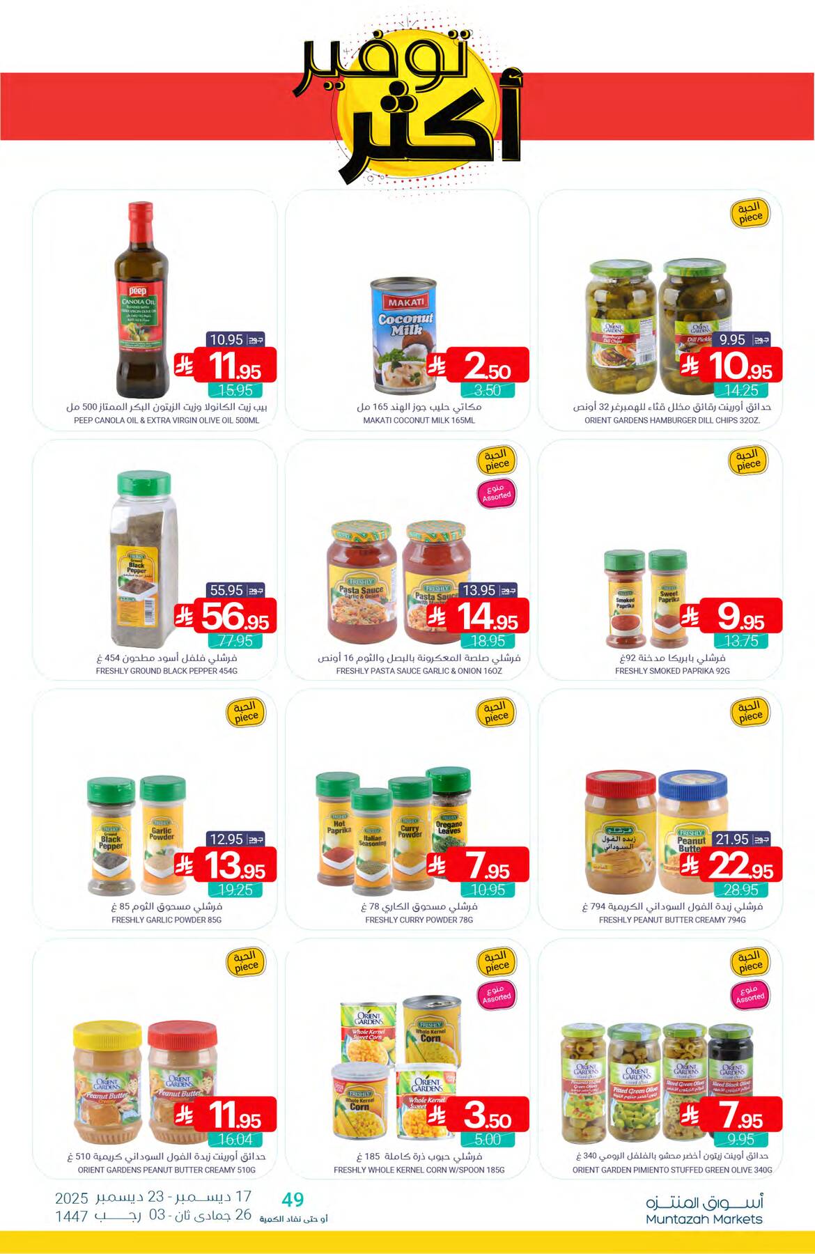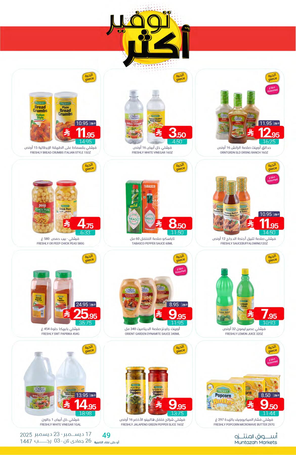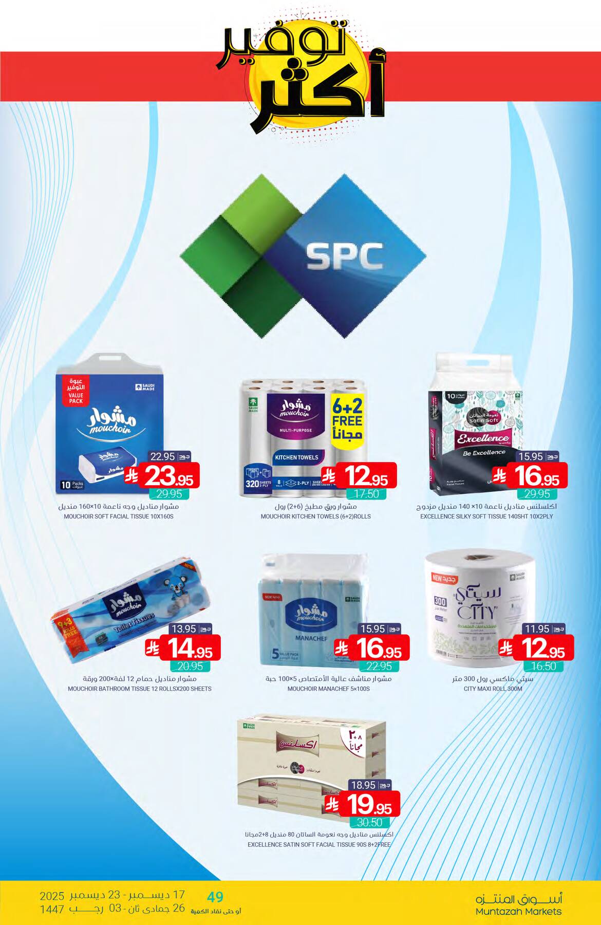 تقدم أسواق المنتزه (Muntazah Markets) حملة ترويجية جديدة تحت شعار “توفير أكثر”، مقدمةً مجموعة من العروض المتنوعة التي تشمل السلع الغذائية الأساسية، الخضروات، والفاكهة، بالإضافة إلى منتجات العناية المنزلية. العروض سارية ابتداءً من 17 ديسمبر وحتى 23 ديسمبر 2025.
