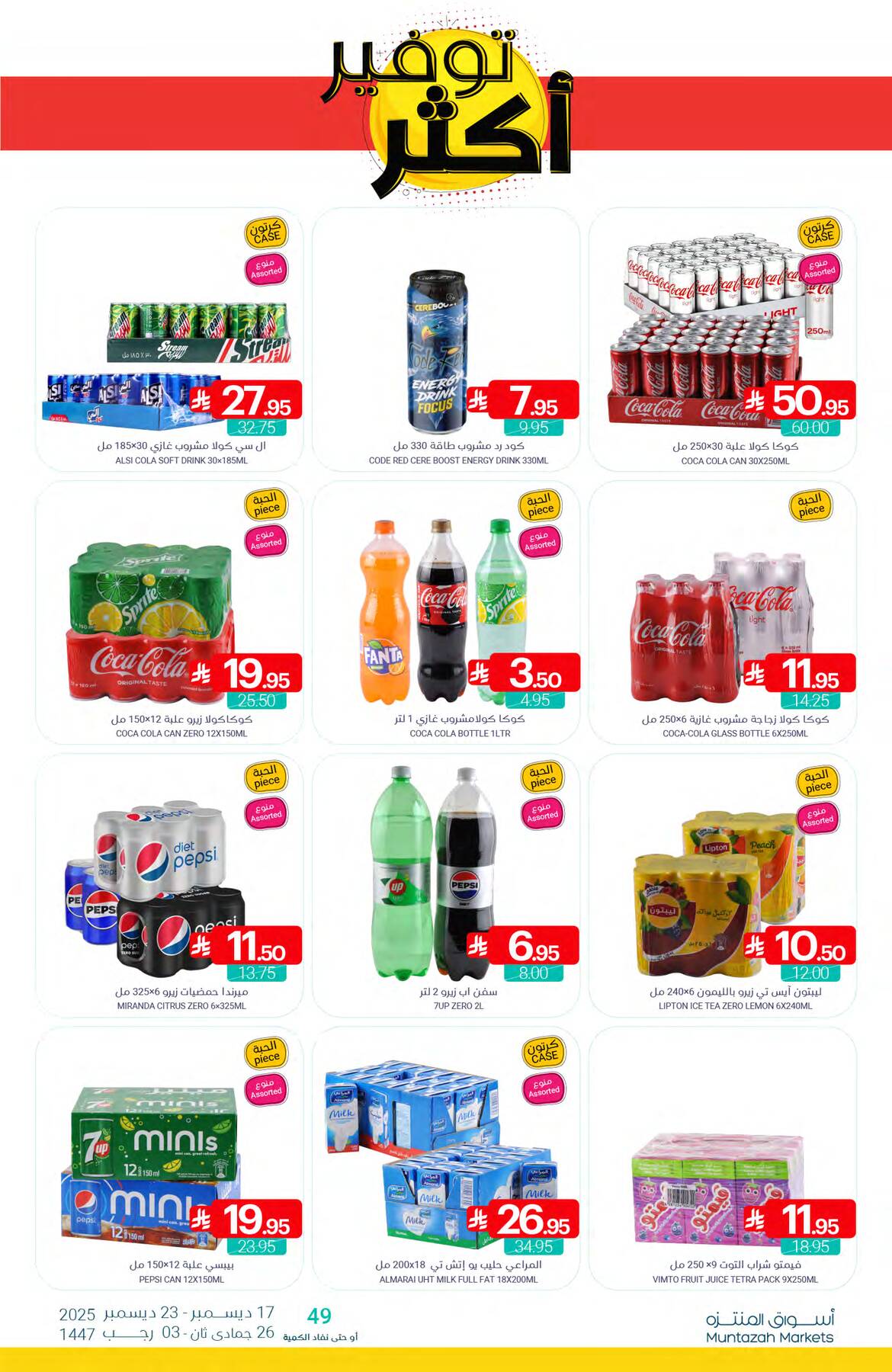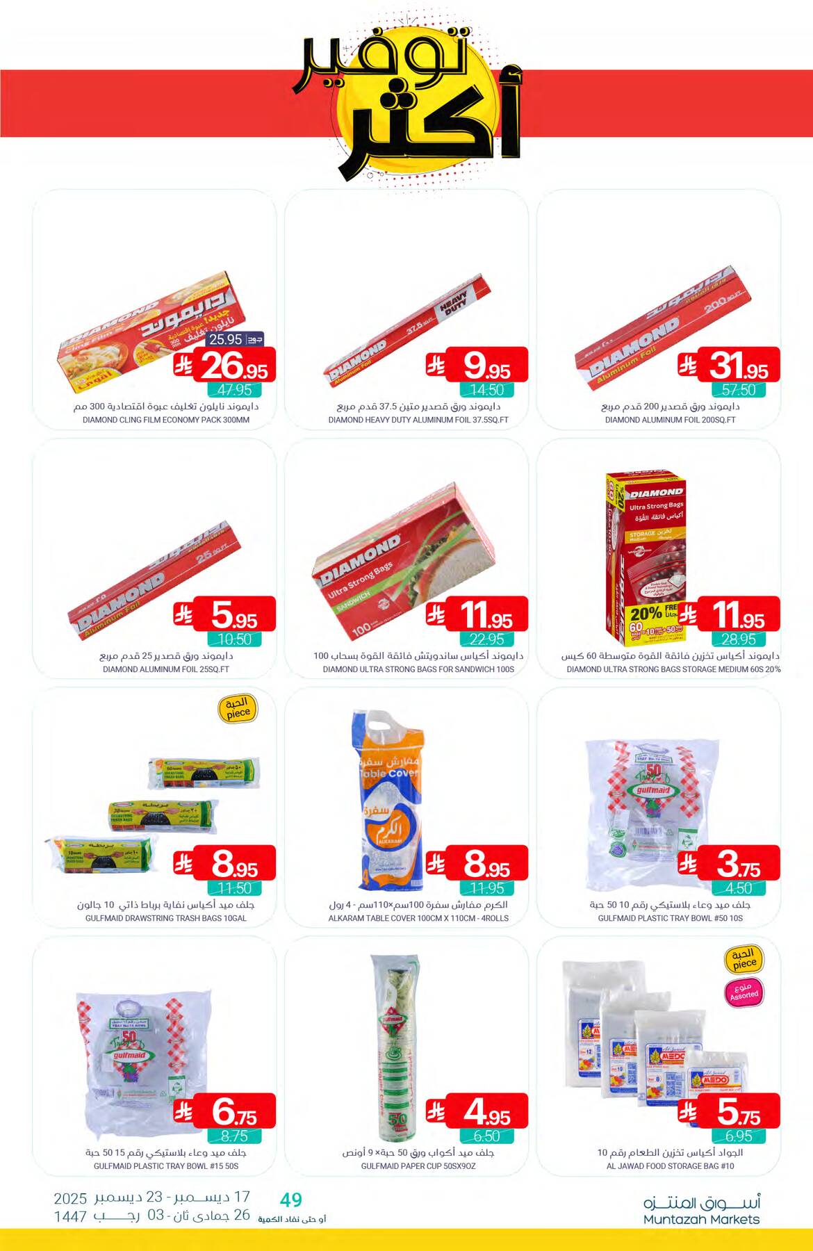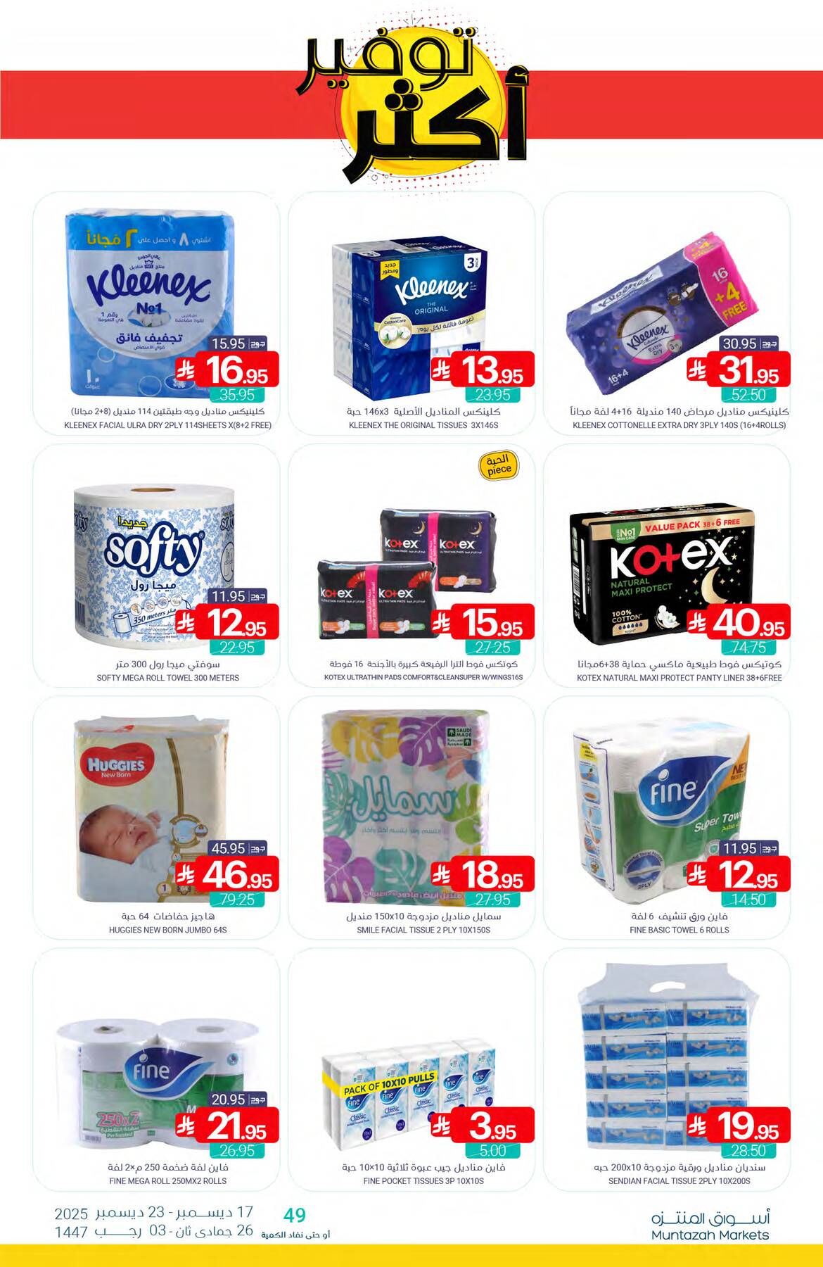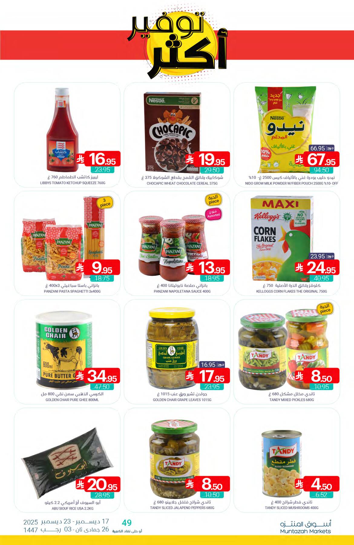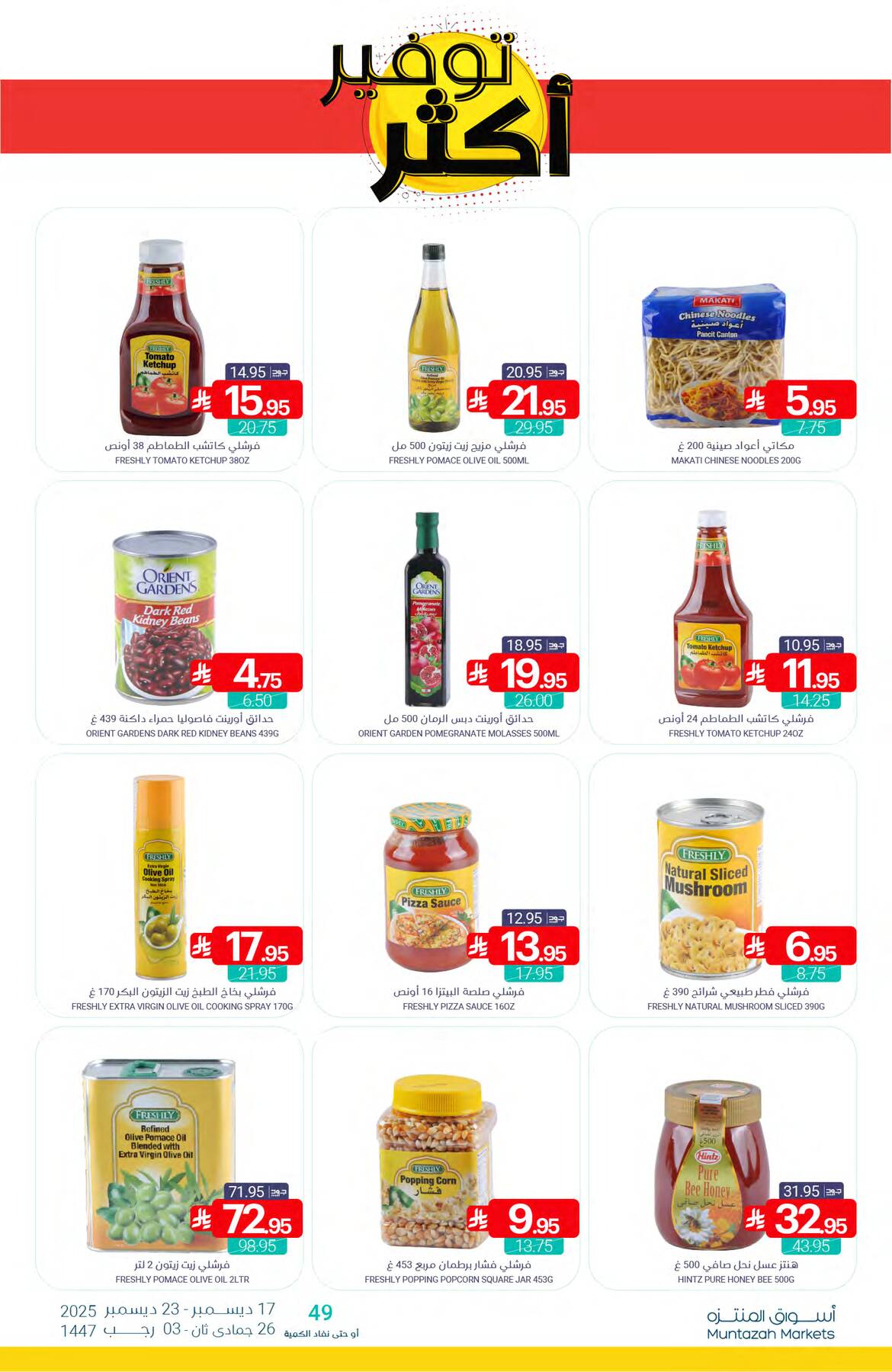 تقدم أسواق المنتزه (Muntazah Markets) حملة ترويجية جديدة تحت شعار “توفير أكثر”، مقدمةً مجموعة من العروض المتنوعة التي تشمل السلع الغذائية الأساسية، الخضروات، والفاكهة، بالإضافة إلى منتجات العناية المنزلية. العروض سارية ابتداءً من 17 ديسمبر وحتى 23 ديسمبر 2025.