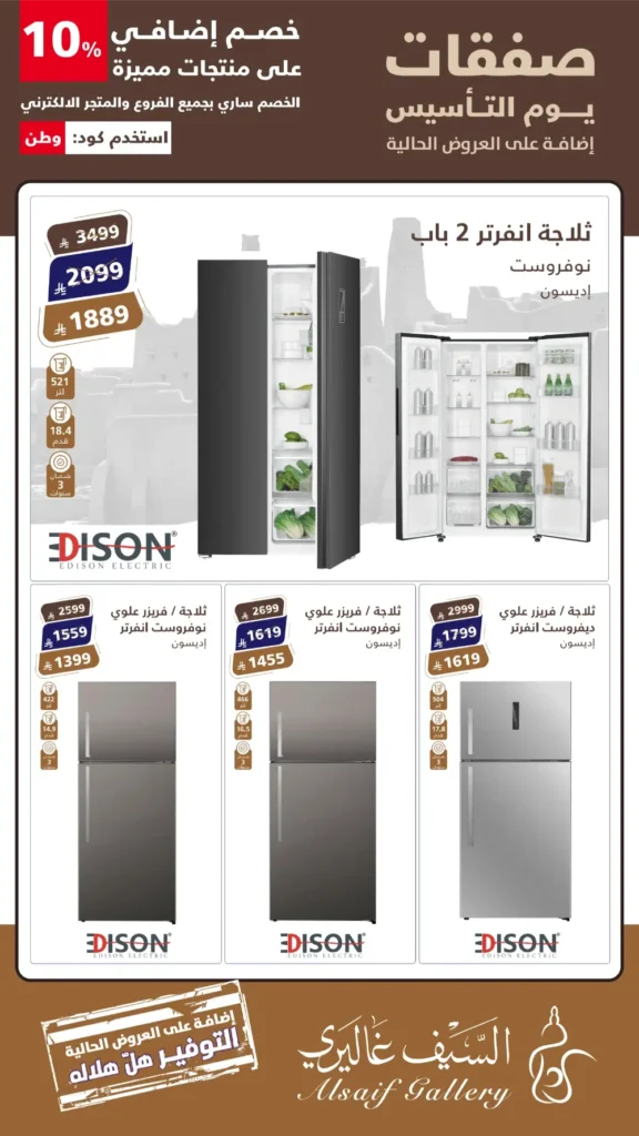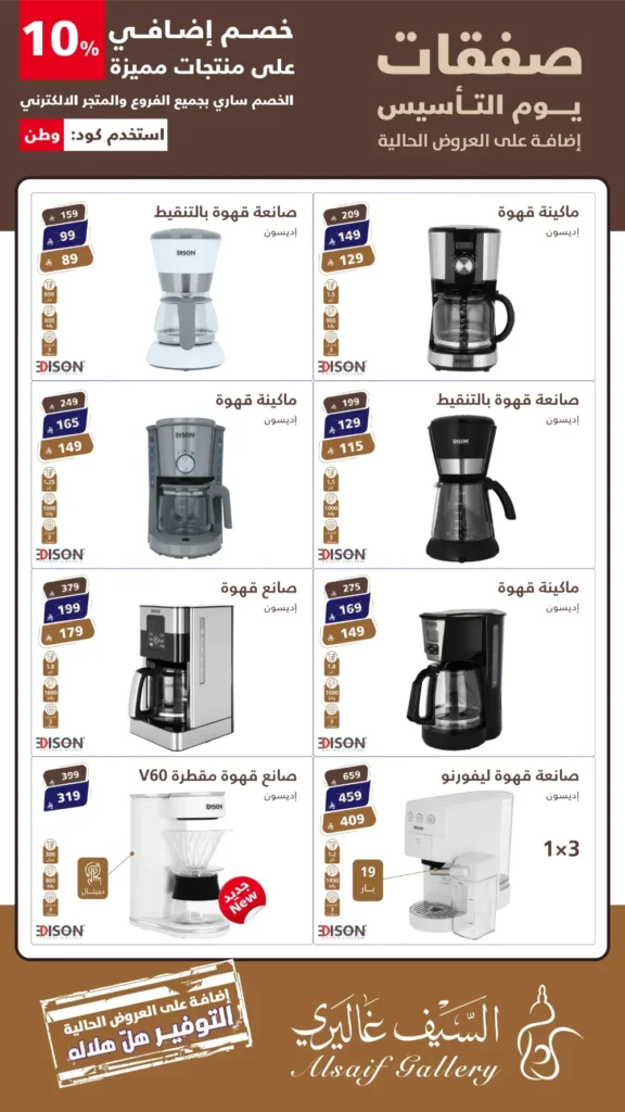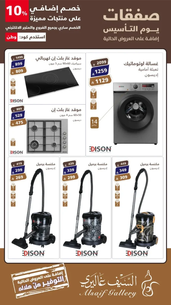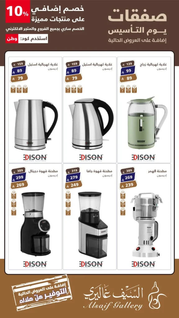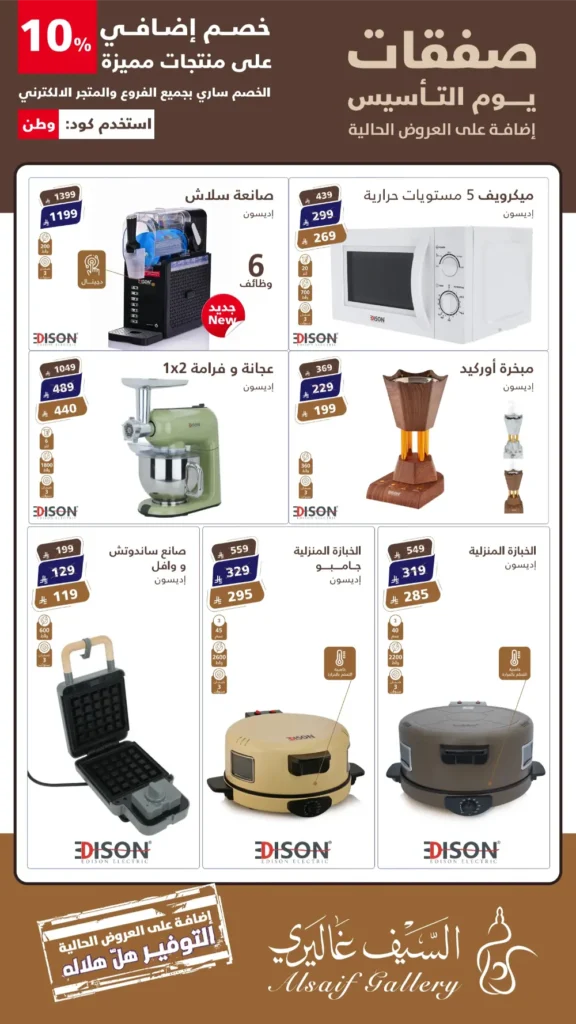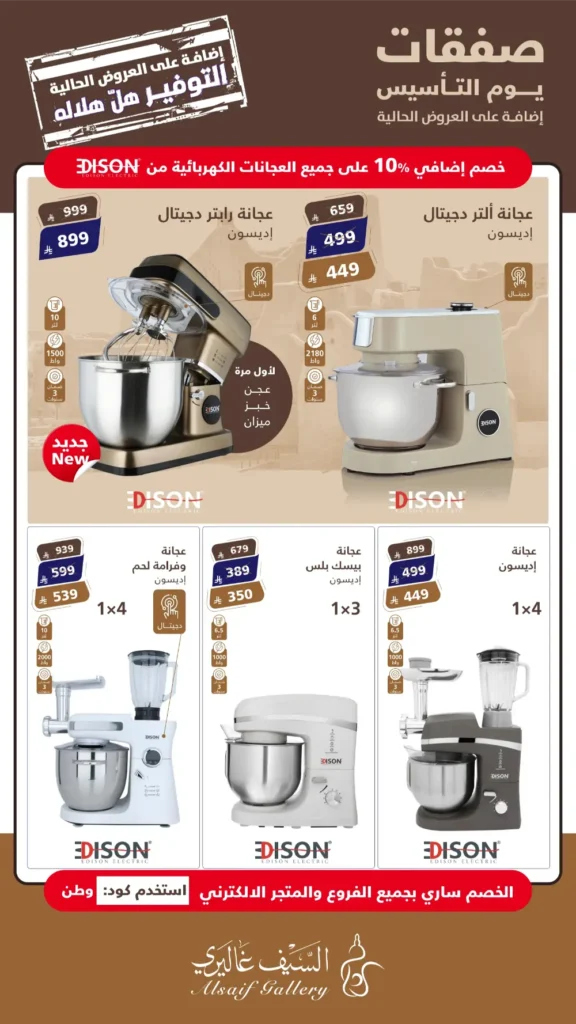 عروض السيف غاليري في يوم التأسيس: خصومات كبرى على الأجهزة الكهربائية بمناسبة يوم التأسيس السعودي، أطلق “السيف غاليري” باقة من العروض الحصرية والمميزة التي تجمع بين الجودة العالية والأسعار التنافسية. إذا كنتِ تبحثين عن تجديد مطبخك أو تجهيز منزلك بأحدث التقنيات، فإن عروض “صفقات يوم التأسيس” هي فرصتك الذهبية لاقتناء منتجات علامة إديسون (Edison) الشهيرة بأسعار لا تُقاوم