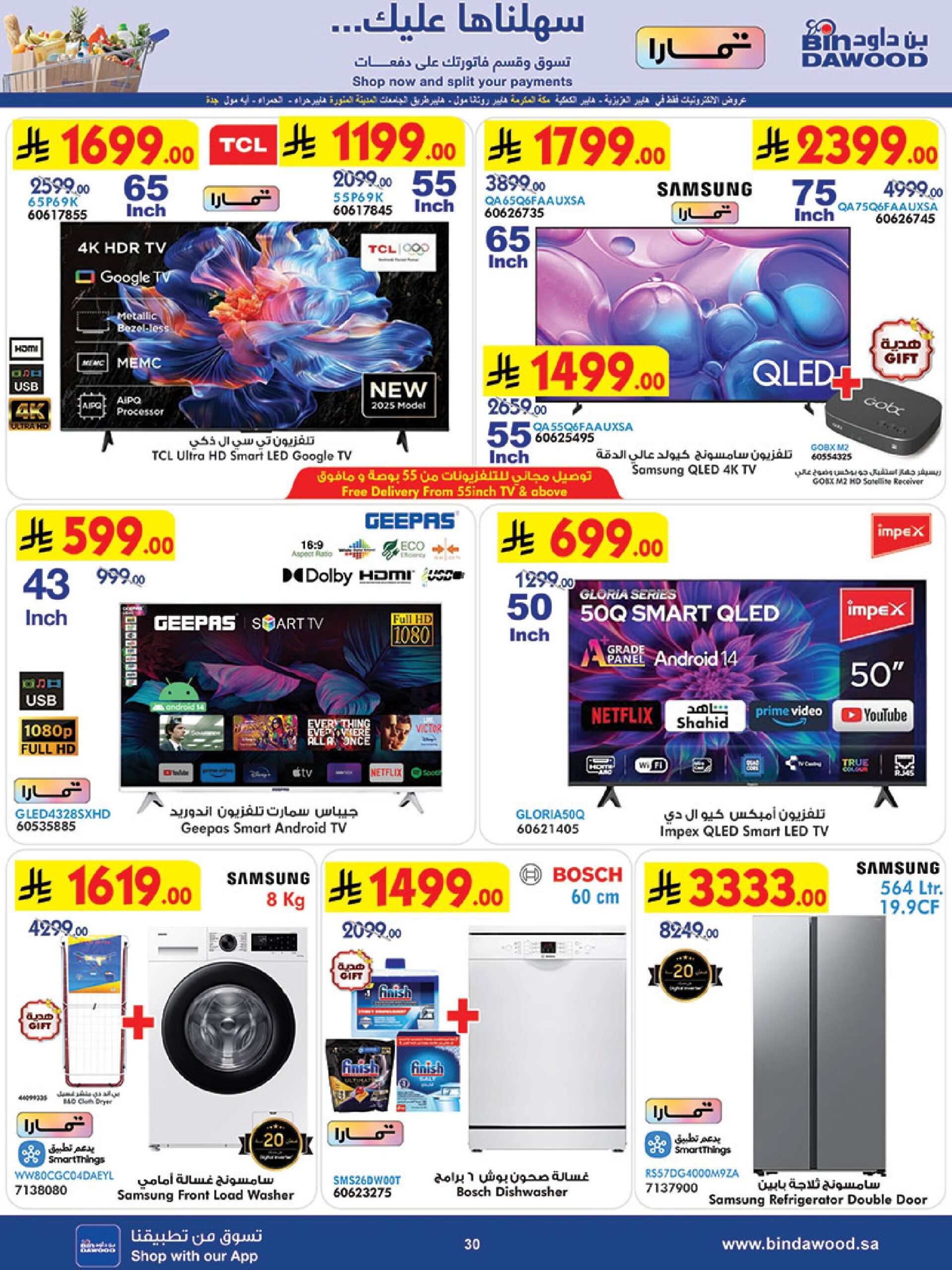 عروض بن داود 2026: مهرجان التكنولوجيا والأجهزة المنزلية بخصومات خيالية أطلقت أسواق بن داود (BinDawood) أحدث حملاتها الترويجية الكبرى تحت شعار “سهلناها عليك”، والتي تقدم من خلالها مجموعة واسعة من الخصومات على الهواتف الذكية، الشاشات، وأدوات المطبخ العصري. وما يميز هذا العرض هو إتاحة الفرصة للمتسوقين لتقسيم فاتورتهم على 4 دفعات بدون فوائد عبر خدمة “تمارا”.