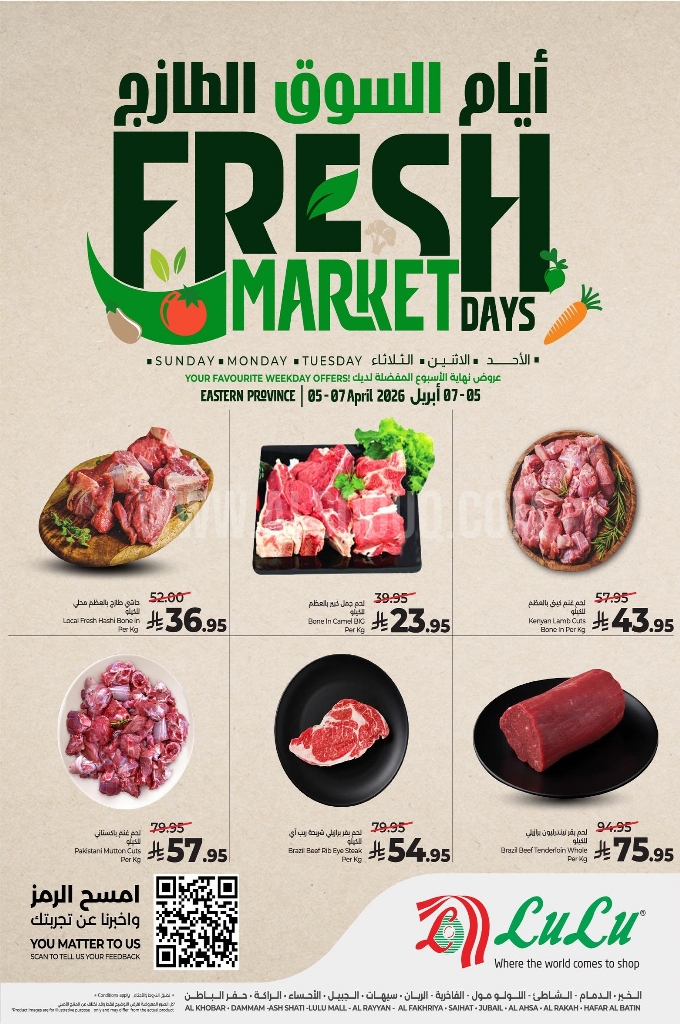 عروض لولو الدمام اليوم 5 أبريل 2026 الموافق 17 شوال 1447 منتجات الفريش وصلت لــ 3 أيام. اكتشف أقوى عروض الطازج اليوم مع خصومات حصرية على الخضروات، والفواكه واللحوم الطازجة في جميع الفروع.