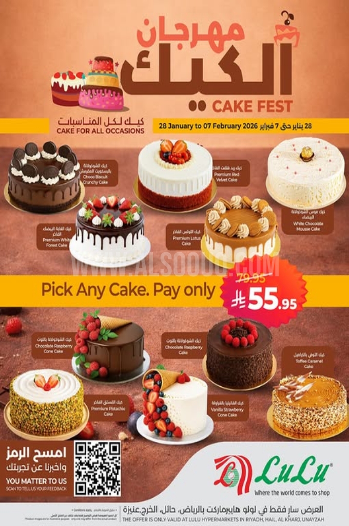 عروض لولو الرياض اليوم 2 فبراير 2026 الموافق 14 شعبان 1447 عروض مهرجان الكيك . استعد لخصومات مذهلة وصفقات لا تقبل المنافسة تسوق منتجاتك المفضلة بأسعار لا تقاوم.