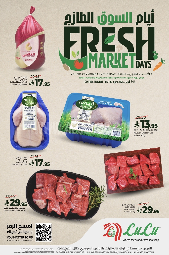 عروض لولو الرياض اليوم 5 أبريل 2026 الموافق 17 شوال 1447 تذوّق القرمشة وعيشها طازجة. اكتشف أقوى عروض الطازج اليوم مع خصومات حصرية على الخضروات، والفواكه واللحوم الطازجة في جميع الفروع.