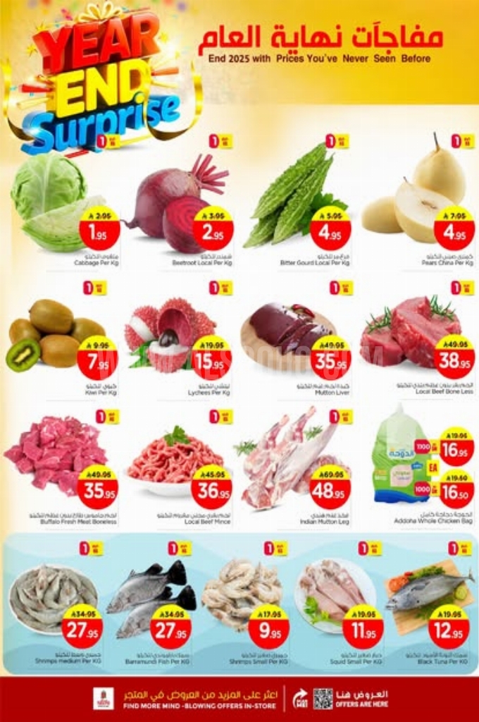 سمك بوري، سمك زبيدي، لحم غنم هندي، لحم بقري برازيلي، لحم عجل باكستاني، لحم حاشي، نقانق دجاج، كبدة دجاج.بصل، طماطم، بطاطس، خيار، جزر، فلفل بارد، باذنجان، كوسة، ملفوف، قرع، موز، تفاح، برتقال، عنب، ليمون، أفوكادو، فطر (مشروم)، فاصوليا خضراء، ثوم، وإليكم الصور الآتية على موقع عروض