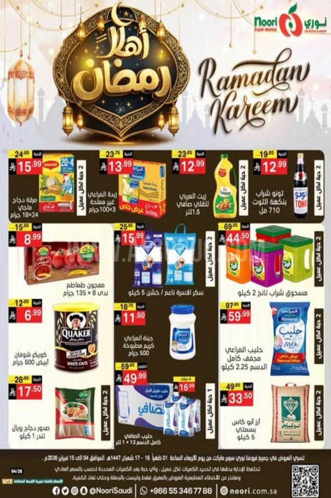 عروض نوري اليوم 4 فبراير 2026 الموافق 16 شعبان 1447 عروض أهلا رمضان . استعد لخصومات مذهلة وصفقات لا تقبل المنافسة تسوق منتجاتك المفضلة بأسعار لا تقاوم.