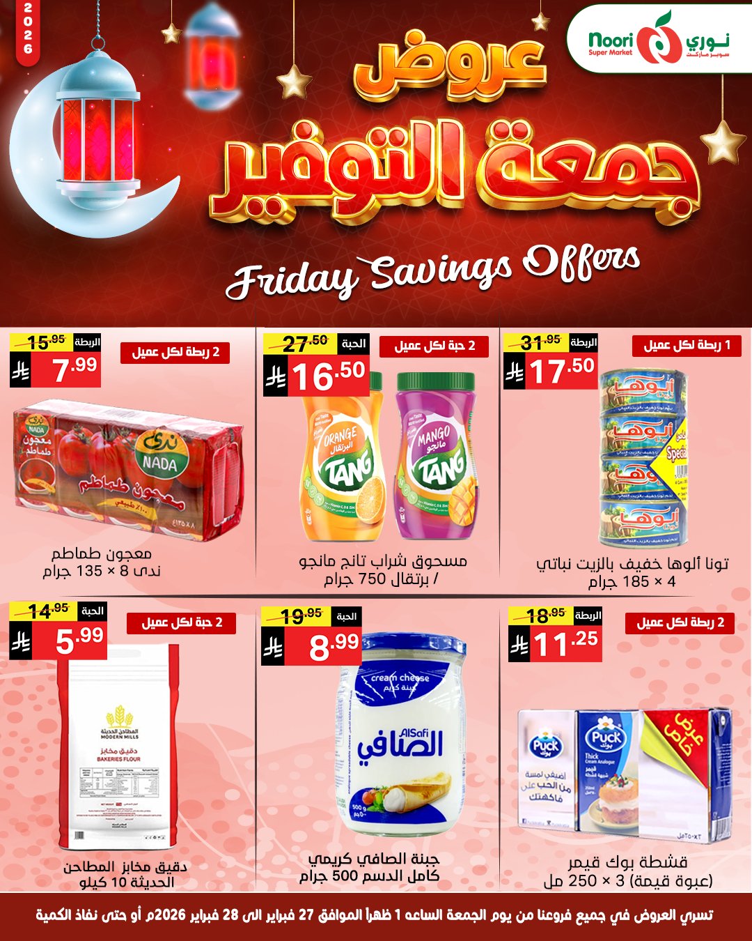 عروض نوري 25 فبراير 2026 | 9 رمضان 1447 رمضانكن عندنا دايماً أوفر.عروض توفير جديدة على المنتجات اليومية بأسعار منافسة وجودة مضمونة لتجربة تسوق ذكية وتوفير حقيقي لكل الميزانيات.