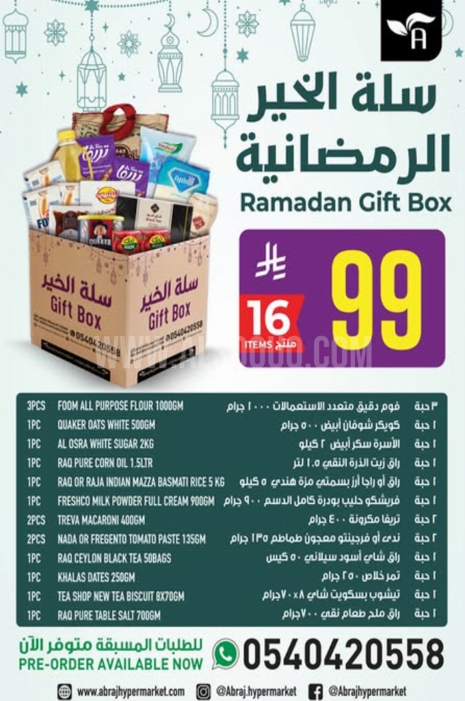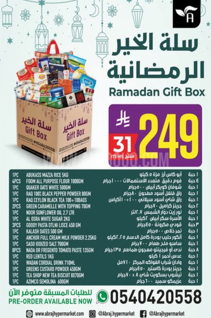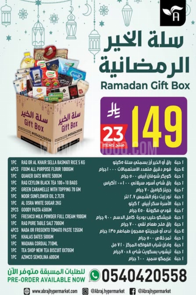 سكر الأسرة ناعم أو خشن، أمريكانا مفروم غنم أو بقري، مياه فيفا للشرب، العربي زيت نباتي، أرز الشعلان مزة بسمتي، كرواسان كبير، بيتزا خضار وسط، بيتزا نقانق صغير، بيتزا دجاج وسط، موز أصفر، موز صغير، أفوكادو، جوز الهند الطري، مانجو جنوب أفريقيا وإليكم الصور الآتية على موقع عروض