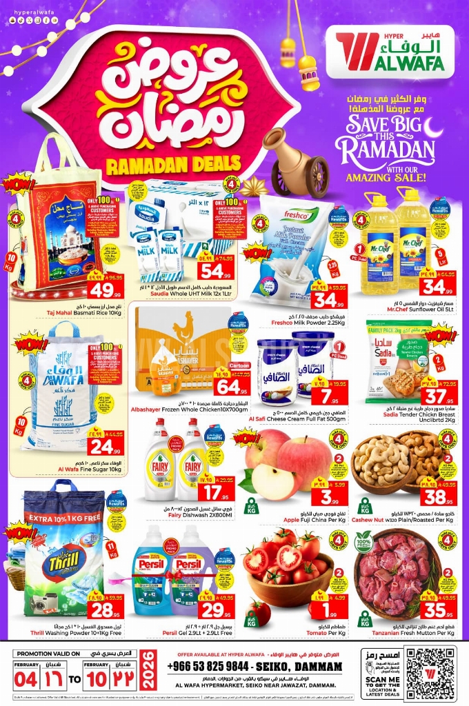 عروض هايبر الوفاء الدمام اليوم 3 فبراير 2026 الموافق 15 شعبان 1447 عروض رمضان عندنا. عروض توفير جديدة على المنتجات اليومية بأسعار منافسة وجودة مضمونة لتجربة تسوق ذكية وتوفير حقيقي لكل الميزانيات.