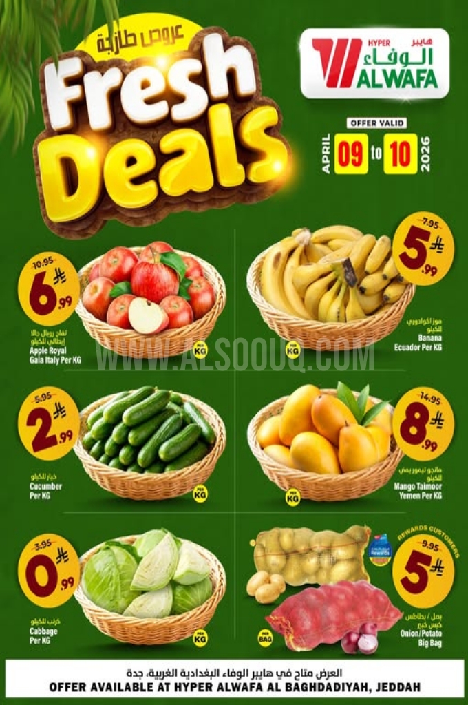 عروض الوفاء هايبر ماركت جدة اليوم 9 أبريل 2026 الموافق 21 شوال 1447 عروض الطازج لــ 2 يوم فقط. تسوقوا الآن مجموعة من المنتجات المميزة المختارة بعناية بأسعار وقيمة تستحق التجربة وتمنحك أكثر مما تتوقع.