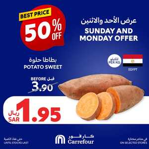 50% خصم في يوميّ الأحد والاثنين يلا زورنا وتقضى اللي تحتاجه العروض فقط متوفرة في كارفور هايبرماركت غرناطة، خريص، لي مول، القصر مول، سندس، رياض بارك،السليمانية، فلامنجو جدة، راشد ميغا مول المدينة، راشد مول الخبر، ويست افنيو الدمام، بريدة، الجوف الشاطئ مول. وإليكم الصور الآتية على موقع عروض
