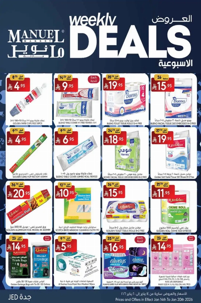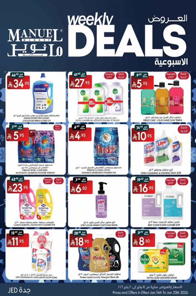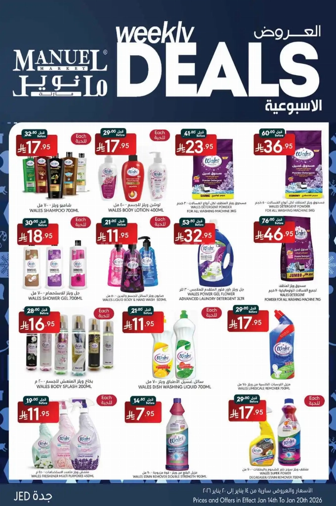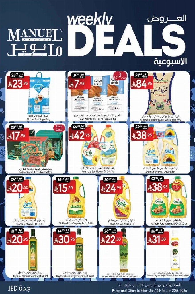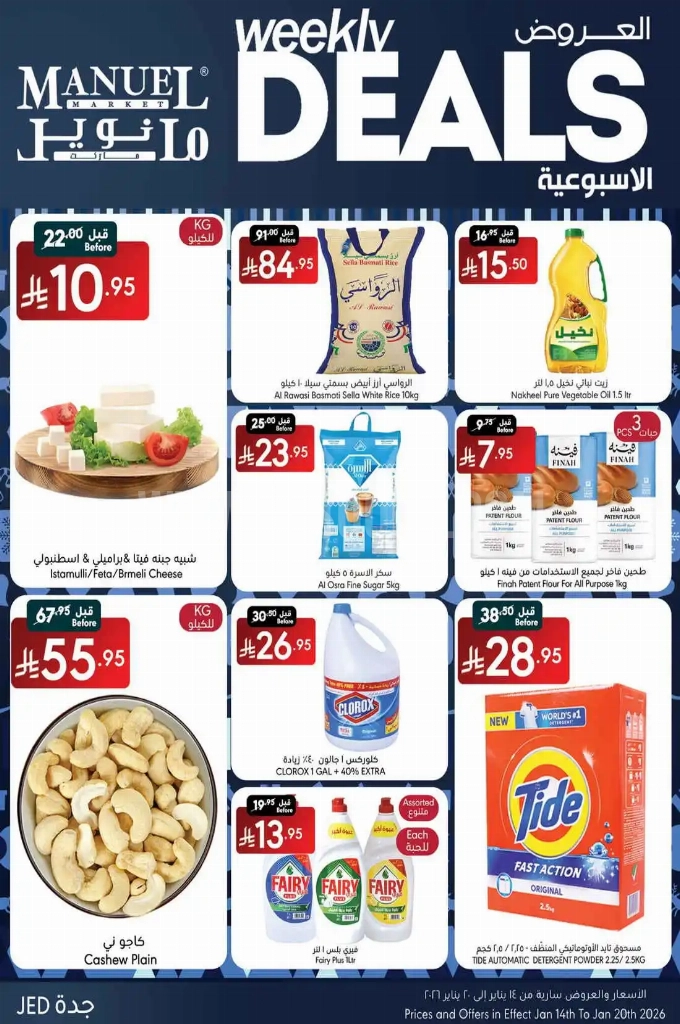 عروض مانويل جدة الأسبوعية 14 يناير 2026 الموافق 25 رجب 1447 العروض الأسبوعية. استعدوا لتخفيضات قوية على السلع الأساسية والمنتجات اليومية بأسعار منافسة وفرص توفير محدودة تناسب جميع الميزانيات.