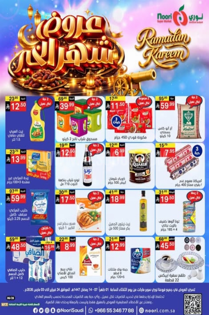 عروض نوري 24 فبراير 2026 | 6 رمضان 1447 عروض شهر الخير. عروض توفير جديدة على المنتجات اليومية بأسعار منافسة وجودة مضمونة لتجربة تسوق ذكية وتوفير حقيقي لكل الميزانيات.