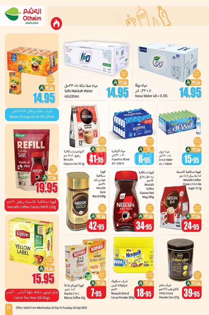 عروض العثيم الأسبوعية 10 سبتمبر 2025 الموافق 18 ربيع الأول 1447 عِـــزّنـــا مِنكـم وفيكُـم. وفر أكثر مع عروضنا الحصرية تخفيضات يومية على المنتجات الغذائية والمنزلية بأسعار ما تنفوت. عروض العثيم لهذا الأسبوع: تجدون ضمن منتجات الأسبوع: مياه شرب صفا, مياه شرب نوفا, مياه شرب نستله, عصير كوكتيل فواكه مشكلة نادك, عصير فواكه مشكلة نادك, عصير مانجو طازج, كوكا كولا, مشروب شعير باربيكان, قهوة جود داي, قهوة نسكافيه, شاي ليبتون. وإليكم الصور الآتية على موقع عروض