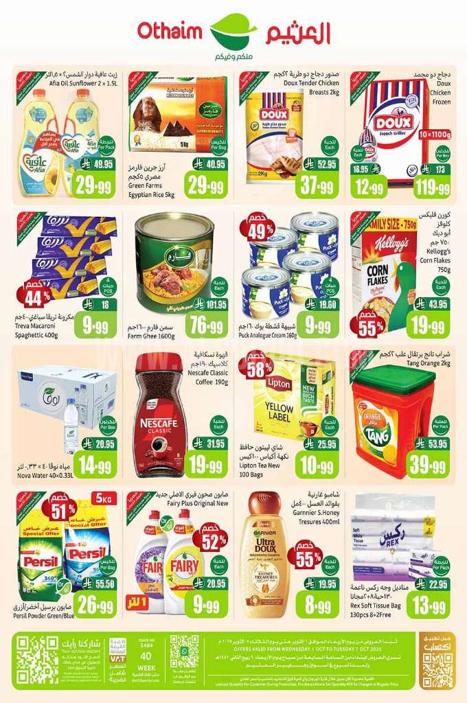 عروض العثيم الأسبوعية 1 أكتوبر 2025 الموافق 9 ربيع الآخر 1447 مهرجان الطبخ. وفر أكثر مع عروضنا الحصرية تخفيضات يومية على المنتجات الغذائية والمنزلية بأسعار ما تنفوت. عروض العثيم لهذا الأسبوع: تجدون ضمن منتجات الأسبوع: فافا بيض/دجاج/باف, فافا مافينز شوكولاتة/فانيليا, سويتز تورتيلا 250 جم, ريتاج يم كيك 400 جم, تاتكو ترفل أبيض/كجم, شوكولاتة مشكلة/كجم, الحصان شوكولاتة تركية/كجم, وإليكم الصور الآتية على موقع عروض