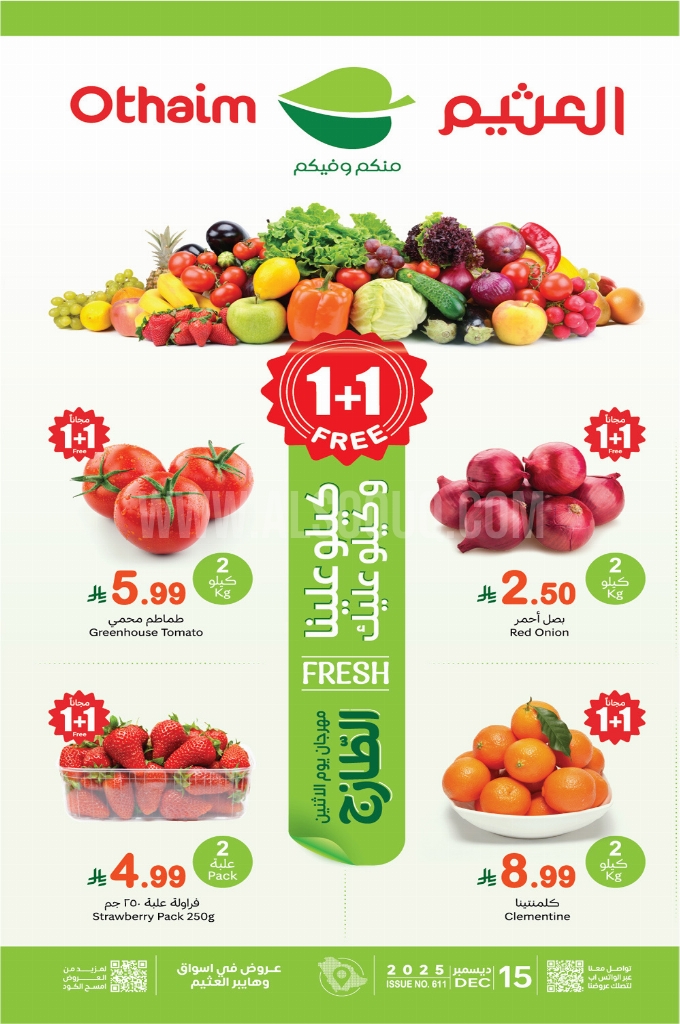 عروض العثيم الطازج اليوم 15 ديسمبر 2025 الموافق 24 جمادى الآخر 1447 مهرجان الخضار بتوفير 1+1 مجاناً