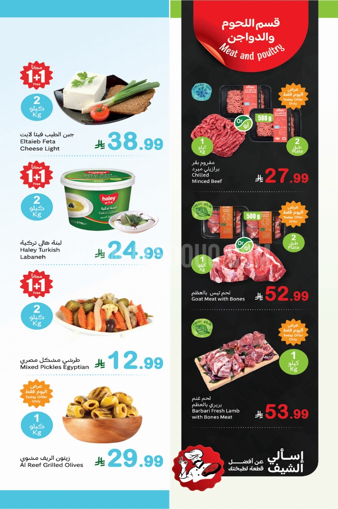 تجدون ضمن منتجات الاسبوع: دجاج تشيلي جوبي/كجم, عصير فواكه طازج 250 مل, أرز دجاج مندي للكيلو, برياني دجاج مالابار للكيلو, أرز دجاج بالزبدة للكيلو, دجاج بروستد نصف حبة, ستربس سمك للكيلو, دجاج مشوي بنكهات مختلفة, دجاج بالزبدة للكيلو, وإليكم الصور الآتية على موقع عروض