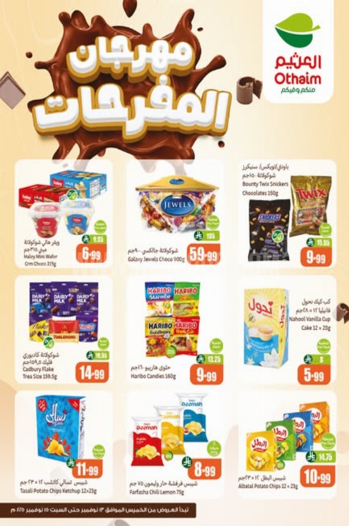 تجدون ضمن منتجات الأسبوع: اللمة ما تكمل بدون سناكات. وفر أكثر مع أقوى عروض مهرجان المفرحات كما يمكنكم تصفح البروشور وخلّك أول المستفيدين في أسواق العثيم. تستمر العروض إلى 15 نوفمبر وحتى نفاد الكمية. وإليكم الصور الآتية على موقع عروض