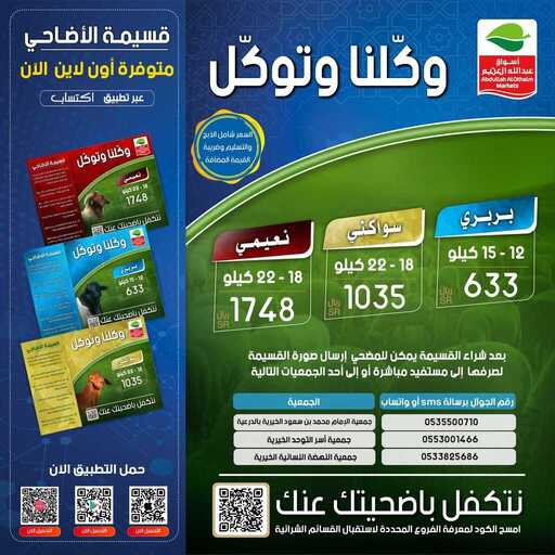 عبدالله العثيم قسيمة الأضاحي .. متوفرة أون لاين عبر تطبيق اكتساب بربري من 12-15 كيلو ب 633 ريال . سواكني 18-22