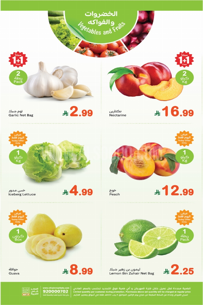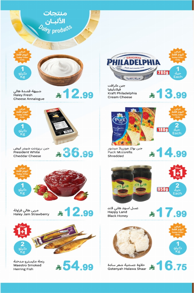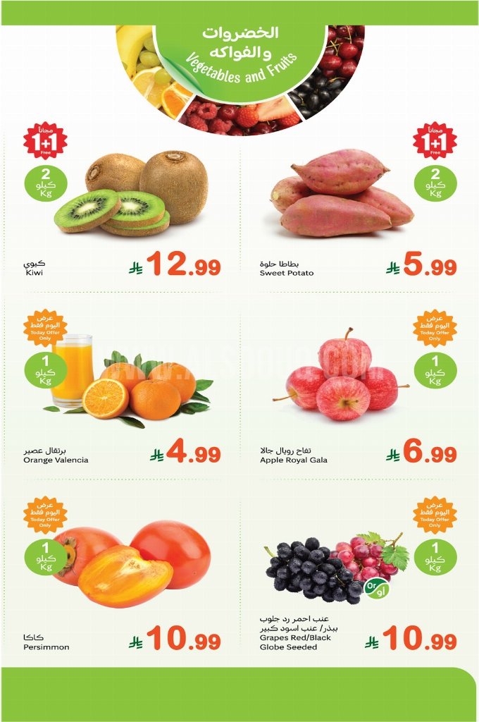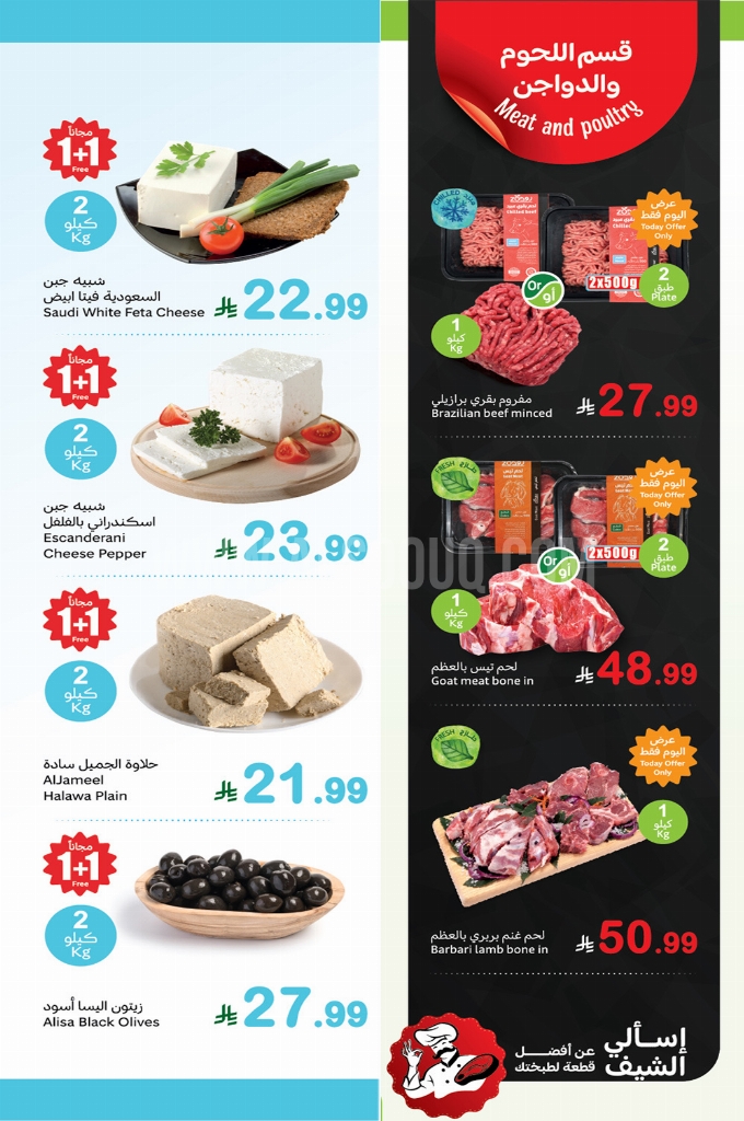 تجدون ضمن منتجات اليوم مجموعة من الخضار والفواكه والمنتجات الطازجة منها: خضروات مشكلة مونتانا، بطاطس كريسكت أو تويستر، لب جوافة أو فراولة مونتانا، دجاج ستربس دو، صدور دجاج ساديا، أفخاذ دجاج ساديا، بروستد دجاج ساديا، ناجتس دجاج ساديا، دجاج دو كامل، لحم مفروم دجاج أو غنم داري، فيليه سمك أبيض أسماك، بطاطس مقلية لامب وستون، نقانق دجاج دو، وإليكم الصور الآتية على موقع عروض