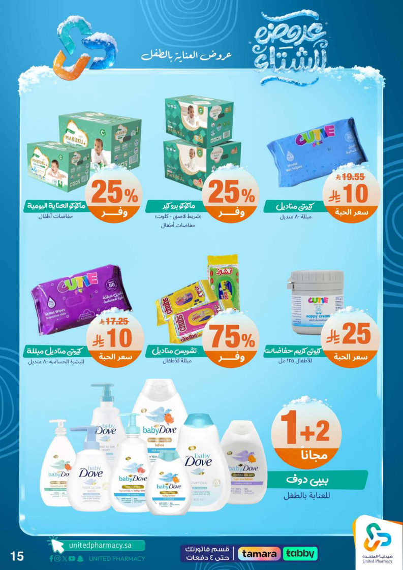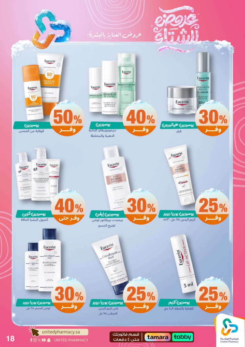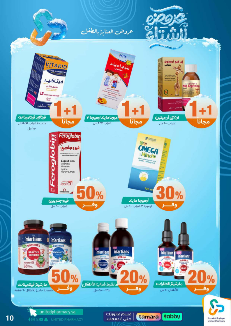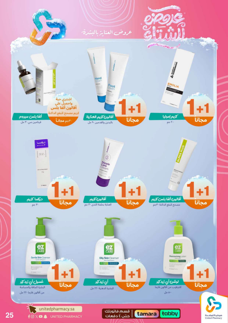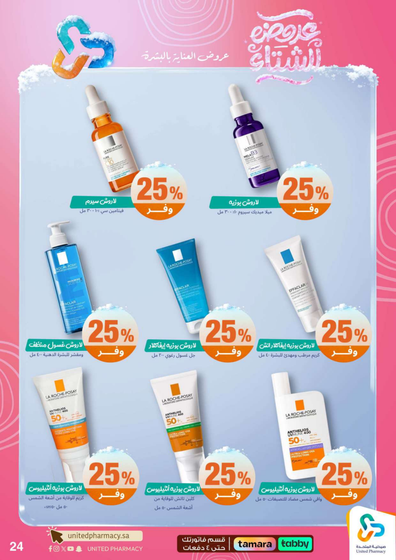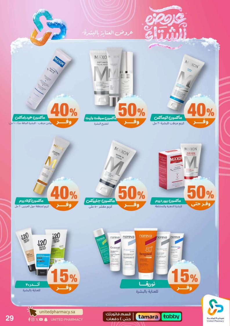عروض صيدلية المتحدة الأسبوعية من 15 ديسمبر 2025 الموافق 24 جمادى الاخر 1447 عروض الشتاء . الجودة تصنع فرقاً والعروض تصنع قرارك! اختر الذكاء اليوم وابتسم للصفقة غداً. عروض صيدلية المتحدة اليوم الاثنين : تجدون ضمن منتجات الأسبوع: صانسيلك شامبو ٣٥٠ مل خصم على السعر . كذلك يوجد لوريال صبغة شعر اكسلانس . تريزمي شامبو ٦٠٠ مل . فوج او اوسوم عطر بخاخ ١٢٠ مل . كما ولدينا صابون ديتول ١١٥ جرام . سجينال مكافح التسوس ٥٠ مل ١٥ % . ريكسونا سبراي ١٥٠ مل . فريدا معطر جو ٤٦٠ مل . دوف رول اون ٥٠ مل . كلوز اب ١٠٠ مل و كلوزاب ٢٥ مل هدية .وإليكم الصور الآتية على موقع عروض.