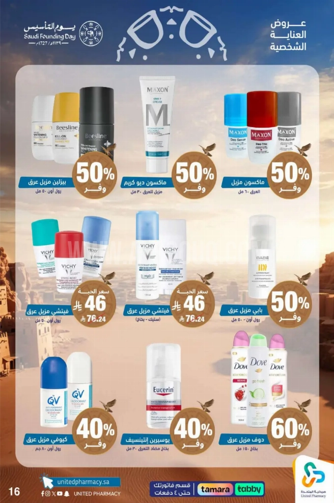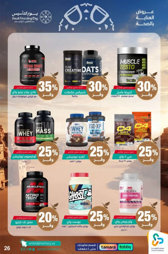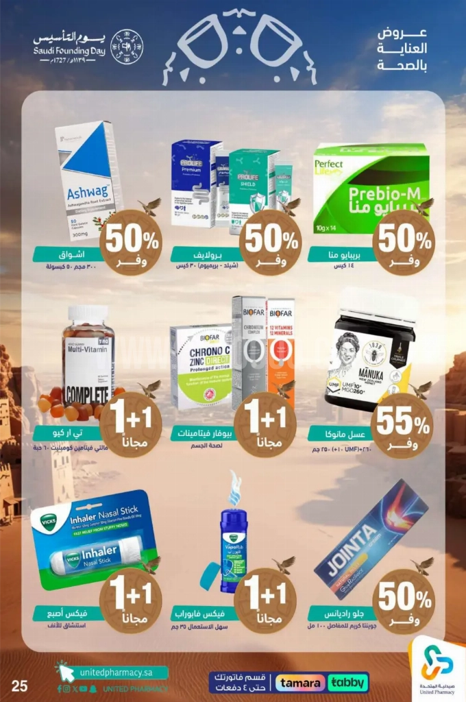 عروض صيدلية المتحدة الأسبوعية 23 فبراير 2026 الموافق 6 رمضان 1447 عروض يوم التأسيس . الجودة تصنع فرقاً والعروض تصنع قرارك! اختر الذكاء اليوم وابتسم للصفقة غداً. عروض صيدلية المتحدة ليوم الاثنين : تجدون ضمن منتجات الأسبوع : فواحة هاتون اسطنبول ايا صوفا ١٥٠ مل . مرش فرش عود ٥٠٠ مل . مرش سبايسي عود ٥٠٠ مل . ستيلا لون كريمي للشفايف و الخدود ٤,٢٥ غرام . فرانك اوليفر بودرة معطر للجسم ٢٠٠ جرام . ماسك عناية بالقدم ١٦ جرام كي اي إس اس . وإليكم الصور الآتية على موقع عروض.