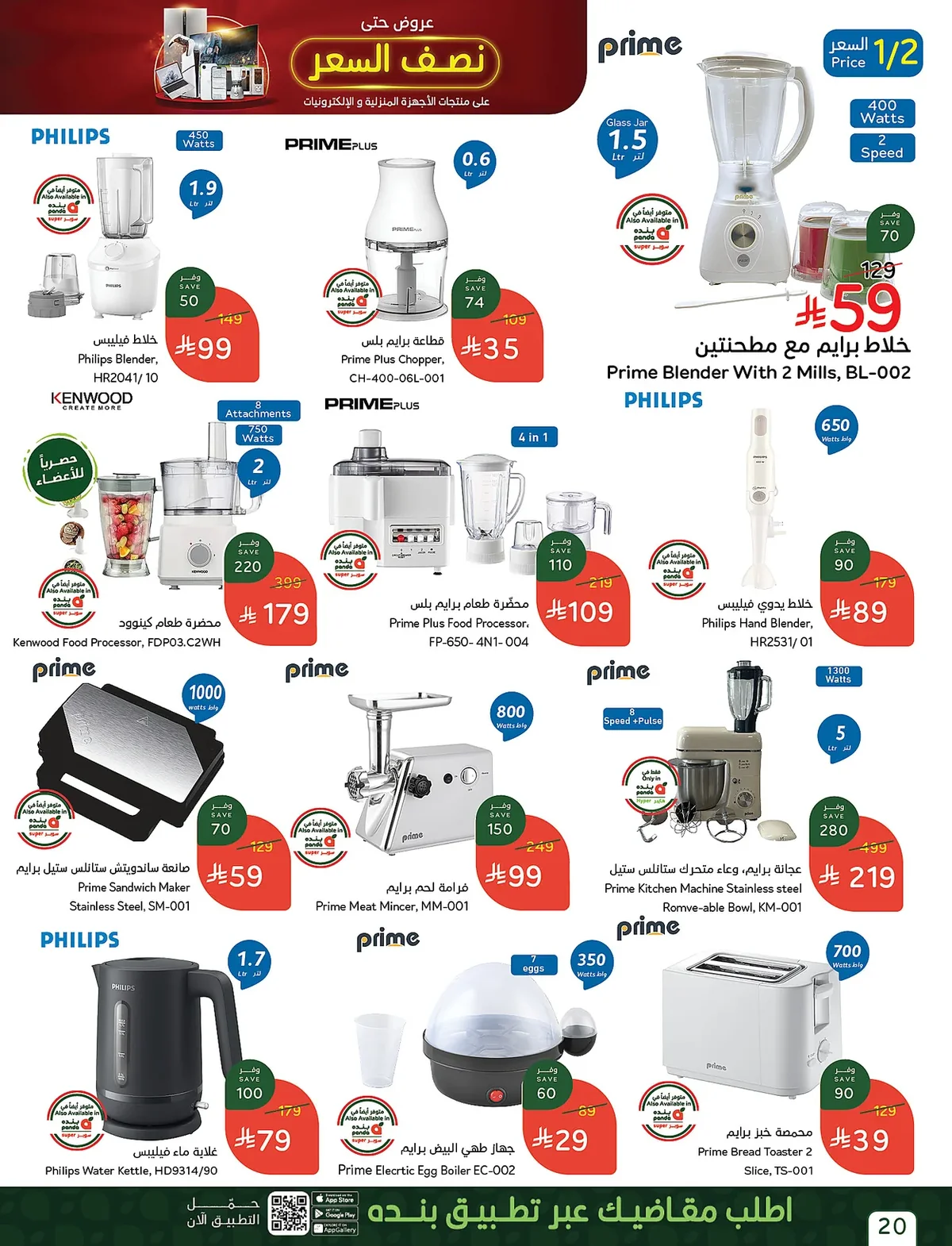جاء خلاط فيليبس 450 واط بسعر 99 ريال بدلًا من 149 ريال، بينما يتوفر خلاط برايم مع مطحنتين بسعر 59 ريال فقط بعد خصم كبير.