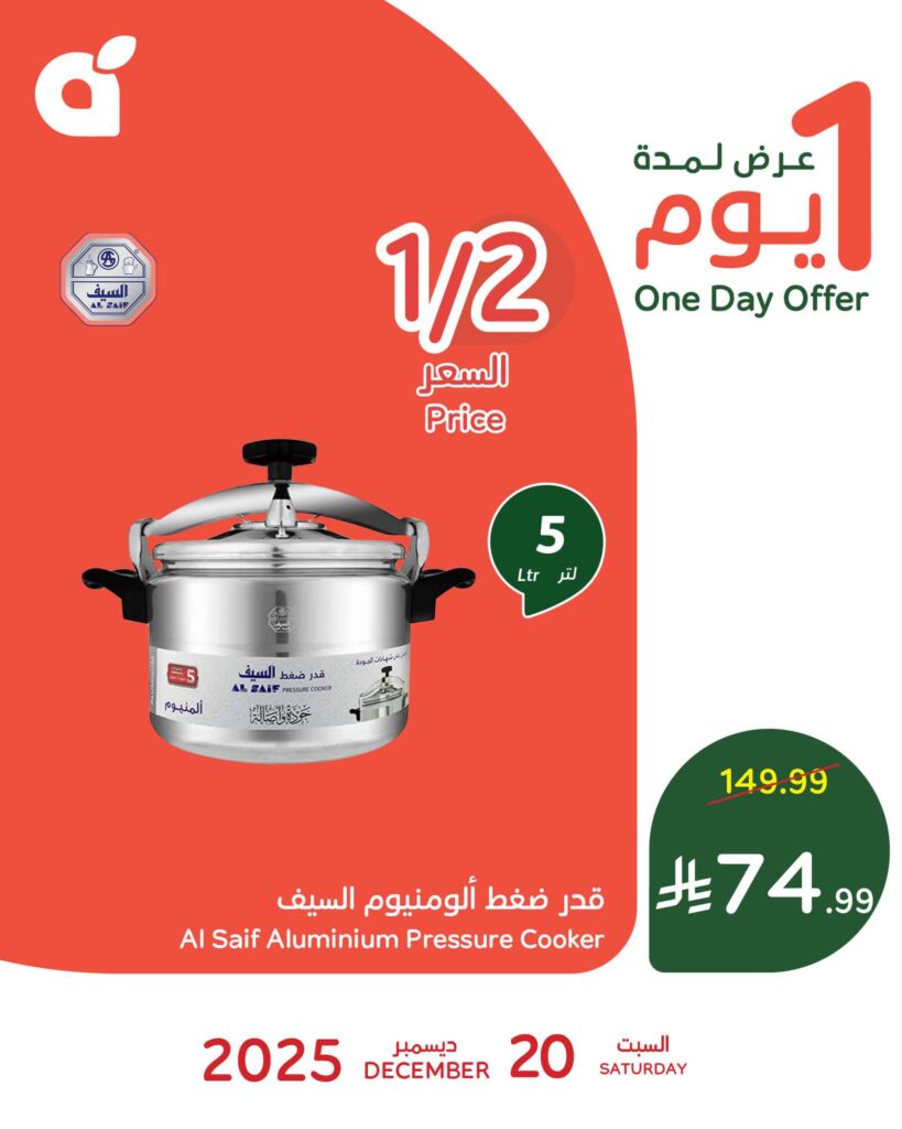 قدر ضغط ألومنيوم السيف (5 لتر): متاح بنصف السعر تماماً بـ 74.99 ريال بدلاً من 149.99 ريال.