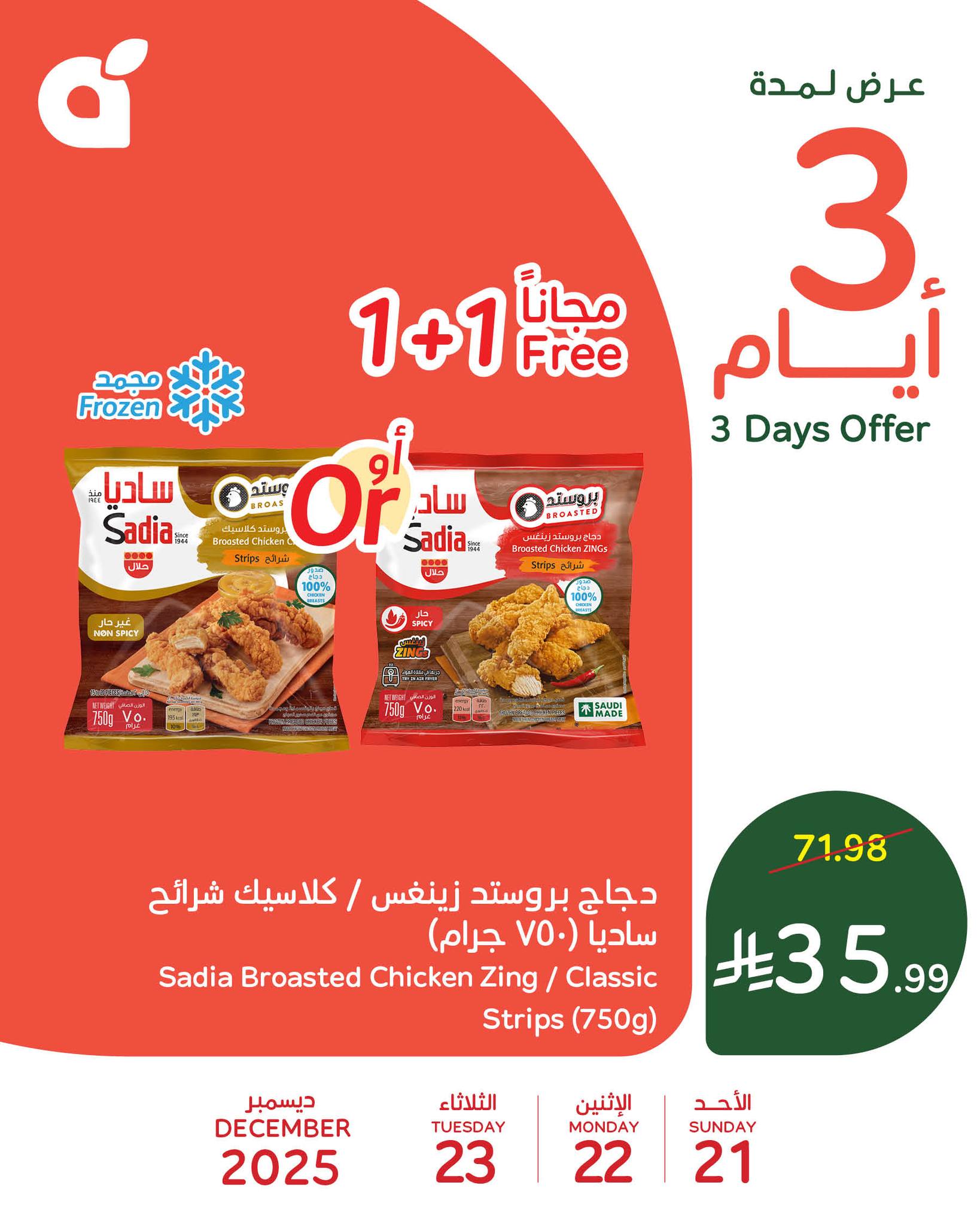 المنتج: دجاج بروستد زينغس (حار) أو كلاسيك شرائح من ساديا (وزن الكيس 750 جرام).