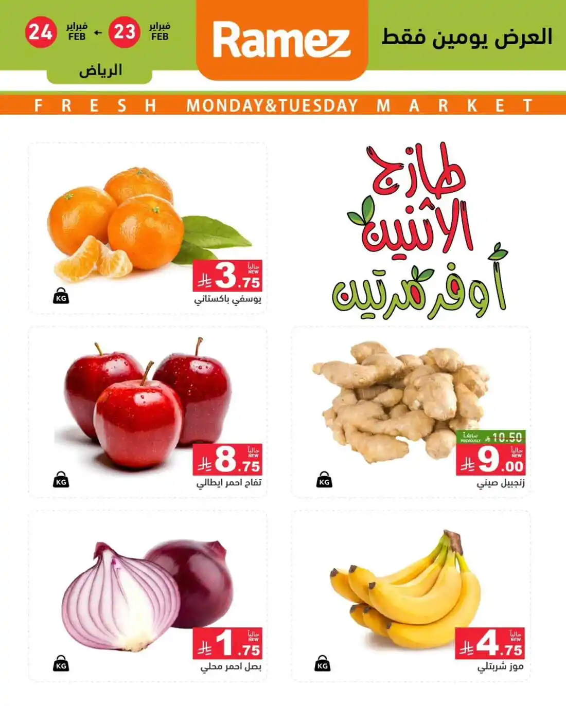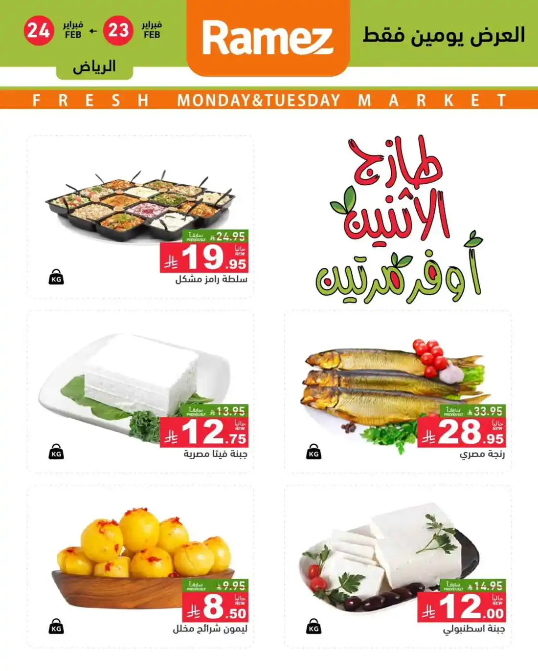 عروض رامز الرياض 23 فبراير 2026 | 5 رمضان 1447 طازج الاثنين. عروض توفير جديدة على المنتجات اليومية بأسعار منافسة وجودة مضمونة لتجربة تسوق ذكية وتوفير حقيقي لكل الميزانيات.